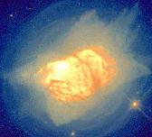 An HST image of the Cygnus Egg (AFGL 2688) in scattered light. Astronomers classify the Egg as a proto planetary nebula, i.e. an evolved star which has blown off much of its outer envelope, but has not completely exposed its hot stellar interior. When this happens, the outer envelope will become ionized and we'll be looking at a young planetary nebula. The Egg has not yet reached this stage, so we're seeing light scattered from the dust around the source. Even though the central star is spherical, the geometry of the scattered light is very complicated. One of the outstanding mysteries in the study of how stars die is how this highly non-spherical geometry develops.