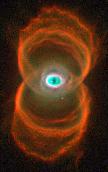 An HST image of the Hourglass Nebula (MyCn 18). This source has evolved beyond the stage of the Cygnus Egg and NGC 7027, showing a planetary nebula in its full glory. Notice the complicated structure of the ionized shells, loops, and filaments. Astronomers don't understand how such a geometry forms.