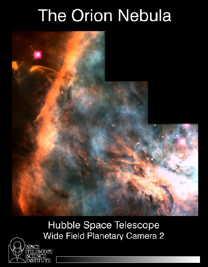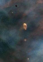 Center: a closer view of the center of the previous image, showing a few such clumps. These are called propylids, and they are believed to be protostars still in the process of forming.