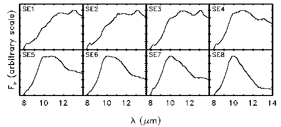 For SE sources, they used the flux ratios of the dust emission at 10, 11, and 12 µm to classify the spectrum. They found that when plotting F10/F12 vs. F10/F11, the spectra defined a narrow curve, which they identified as the silicate dust sequence. They used this sequence to improve on the classification system introduced by Little-Marenin & Little (1988, 1990), dividing it into eight segments, labelled SE1-8. SE1 spectra have low flux ratios and could be described as broad, low-contrast features peaking ~12 µm. SE8 spectra have high flux ratios and represent the classic, narrow silicate feature at 10 µm. In between are the structured silicate emission classes. Figure 1 illustrates all eight SE classes.