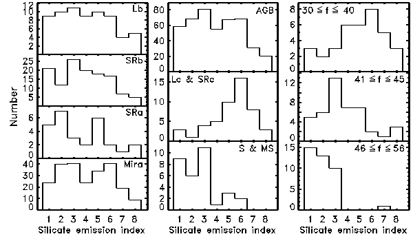 Sloan & Price (1996) expand the AGB sample to include 24 S stars and 65 supergiants (variability class SRc or Lc). They supplement the small S star sample with 19 MS stars from the AGB sample. As shown in Figure 2, the distributions of classes of oxygen-rich dust spectra among the four variability classes in the AGB sample show no obvious differences. However, the AGB sample as a whole differs significantly from the supergiants, which tend to show classic silicate emission, and the S and MS stars, which concentrate strongly in the broad emission classes. Furthermore, separating the Mira variables by the shape of their light curves reveals that stars with symmetric light curves (f ~ 50) show only broad emission while stars with more asymmetric light curves have more classic silicate emission (as first pointed out by Vardya et al. 1986). It is suprising that the four variability classes in the AGB sample have such similar spectral distributions when considering how the distributions vary with the shape of the light curve among the Miras and how the percentage of 13 µm sources changes with variability class.