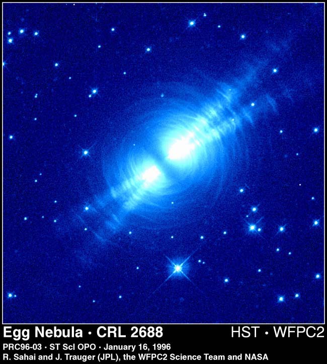 An HST image of the Cygnus Egg (AFGL 2688) in scattered light. Astronomers classify the Egg as a proto planetary nebula, i.e. an evolved star which has blown off much of its outer envelope, but has not completely exposed its hot stellar interior. When this happens, the outer envelope will become ionized and we'll be looking at a young planetary nebula. The Egg has not yet reached this stage, so we're seeing light scattered from the dust around the source. Even though the central star is spherical, the geometry of the scattered light is very complicated. One of the outstanding mysteries in the study of how stars die is how this highly non-spherical geometry develops.