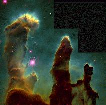 Right: a close-up of part of the Eagle Nebula in Serpens (M16). Molecular clouds tend to be very clumpy, and when massive stars ignite, material in the shadows behind the clumps will be protected while material in other areas will be swept away and evaporated. The pillars of dust in this image are all hiding behind large clumps (at the tops of the pillars). These clumps are probably other stars in the process of forming.