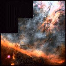 Left: an HST image of the Great Nebula in Orion (M42). Here, the cluster of massive stars in the center (the Trapezium) has ionized a large region on the edge of the molecular cloud. The bright ridge along the bottom of the nebula, the Orion Bar, is the interface between the ionized region and the neutral molecular cloud.