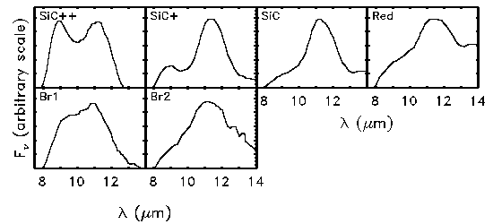 Sloan, Little-Marenin, & Price (1996) examine the sample of 96 carbon stars associated with the AGB (see also Little-Marenin, Sloan, & Price 1996). Nearly all of the sample show dust emission, although three sources have oxygen-rich dust (two are the well-known silicate/carbon stars BM Gem and V778 Cyg). The remainder of the sample belong to one of six classes (Fig. 3).