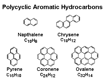 PAHs generally consist of several hexagonal rings. The figure to the left illustrates a few common simple PAHs. This figure was adapted from a figure produced by the NASA Ames Astrochemistry Lab., whose home page contains lots more information about PAHs and how they're studied on Earth. My focus is on PAHs in space.