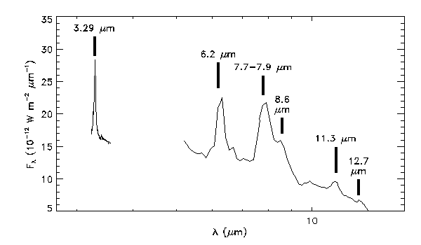 Above: A spectrum of the Red Rectangle, showing the Unidentified Infrared Emission Bands from 3 to 13 µm. These bands appear in the infrared spectra of many objects, and remained an enigma for over a decade after their discovery. The 3 µm data are from Sloan et al. (1994), the 5-8 µm data were provided by Jesse Bregman, and the 7-14 µm data are from Sloan et al. (1993).